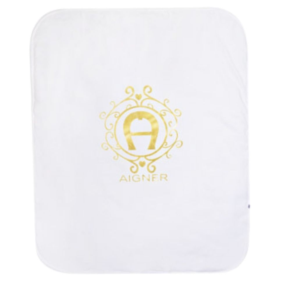Ivory and gold blanket for baby boys and girls by Aigner. Made from lightly padded cotton, it features the brands iconic horseshoe logo and name on the front in gold foil. Matching items available to purchase separately.