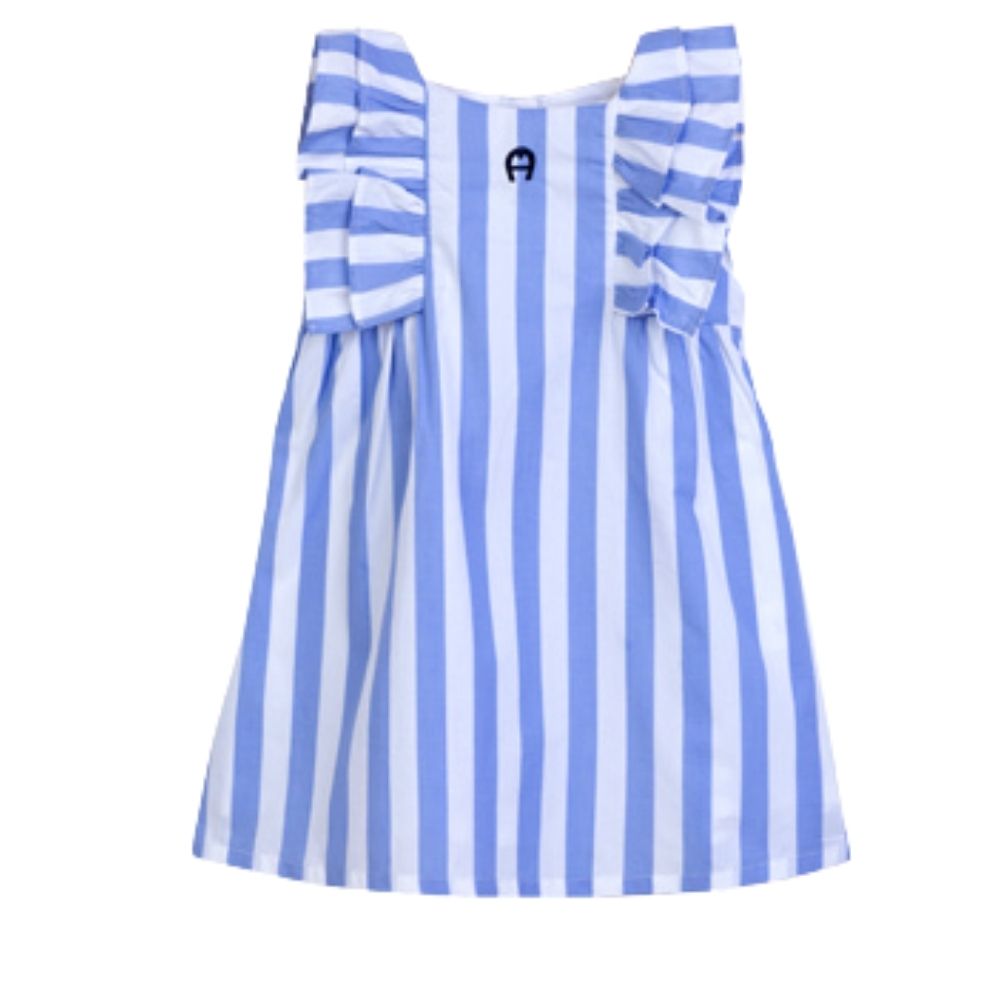 This Aigner kids' dress, features a delightful blue and white striped pattern that exudes a fresh and summery vibe. The dress is adorned with playful ruffled sleeves that add a touch of elegance and movement, making it perfect for twirling. The subtle Aigner logo at the chest adds a refined brand touch without overpowering the design. Crafted with high-quality materials, this dress is both comfortable and stylish, ideal for any casual or semi-formal occasion. Its light and breezy fabric ensures that your little one stays cool and comfortable while looking chic.