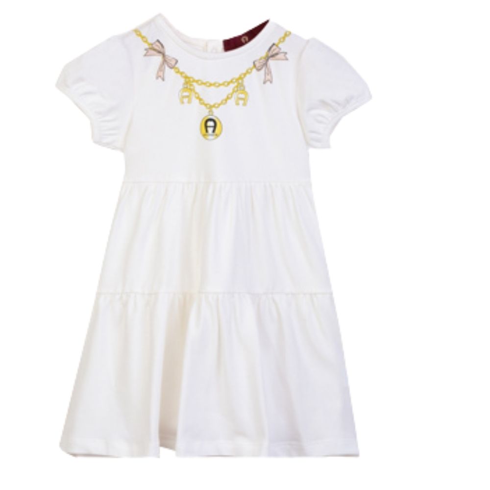 This Aigner kids dress exudes timeless elegance with a touch of playful sophistication. The dress is primarily white, featuring a charming printed gold chain necklace design on the bodice, accented by delicate bows. The short puff sleeves add a sweet, classic detail, while the tiered skirt gives the dress a gentle flow, making it perfect for twirling. Ideal for special occasions or a stylish everyday look, this dress combines comfort with a luxurious aesthetic that any young girl would adore.