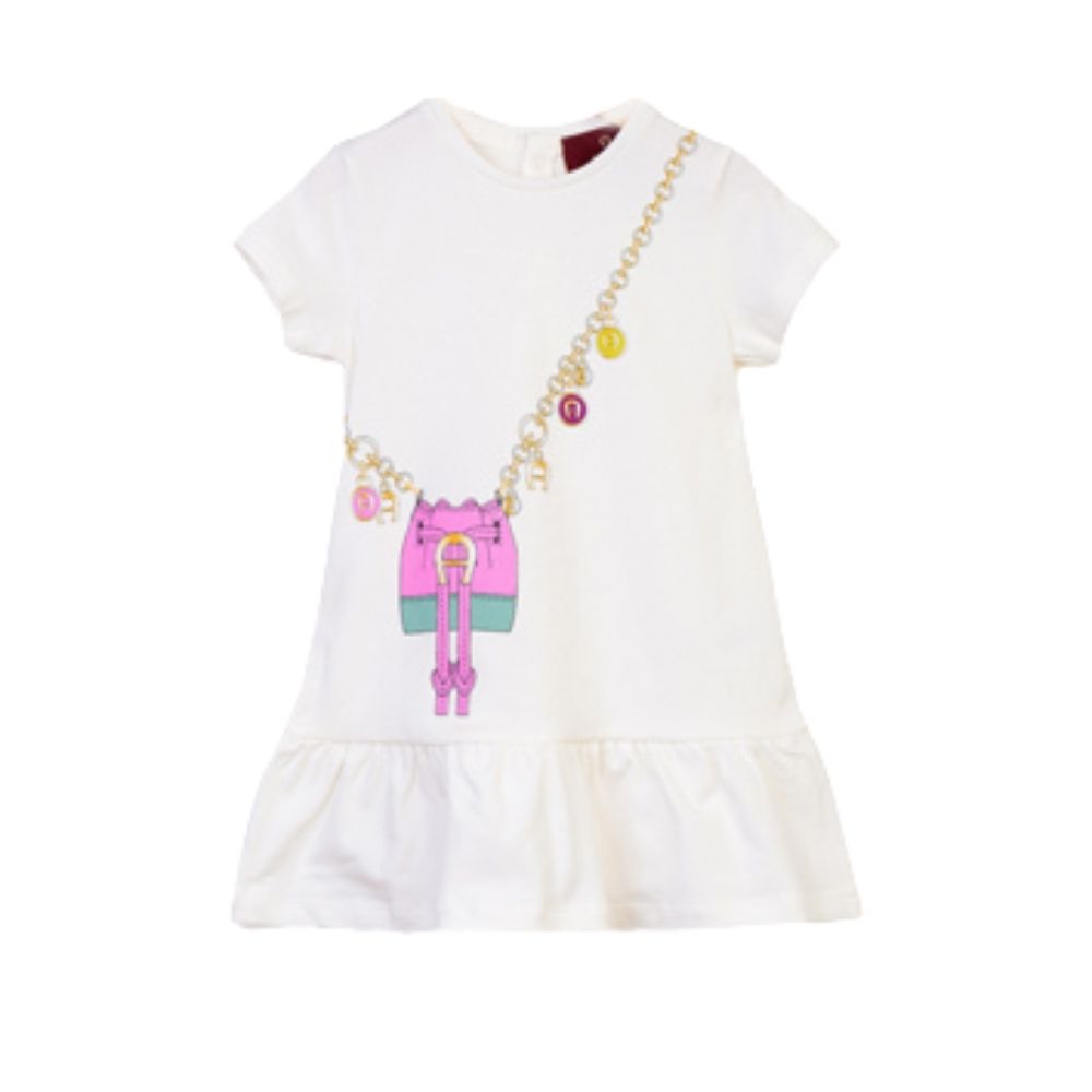 Pretty white dress for girls by AIGNER, made in soft cotton jersey for comfort. It has a cute trompe l'oeil handbag print on the front in pink, turquoise and gold colours for a girly look. The dropped waist creates a pretty, feminine silhouette and there are cute, capped sleeves. The bright logo badge on the back of the neck adds a branded touch.