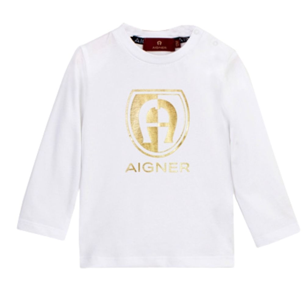 White logo long sleeve top for girls by Aigner. Made from soft cotton, it features the brand's iconic horseshoe logo print in gold foil on the front.