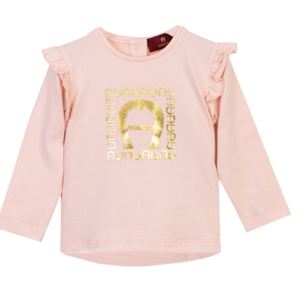 Pink logo long sleeve top for girls by Aigner. Made from soft cotton, it features the brand's iconic horseshoe logo print in gold foil on the front and it has a ruffled trims over the shoulder and it fasten with a poppers at the back for easy dressing.