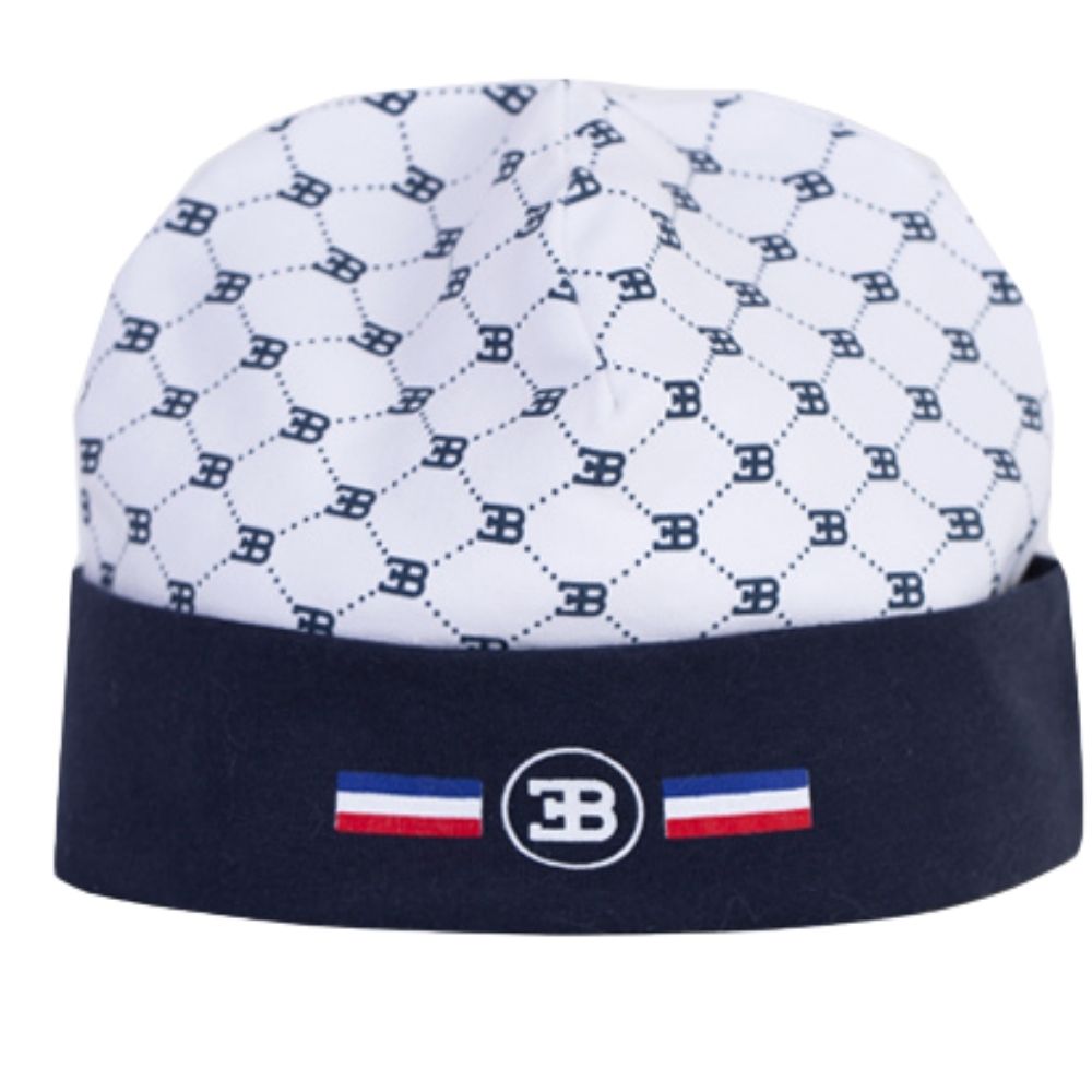 Navy logo knit beanie for baby boys from Bugatti Kidswear. Made from soft Italian yarn, this beanie has a geometric logo pattern on white and navy trim with the logo and can be worn with a loose fit for a relaxed look.