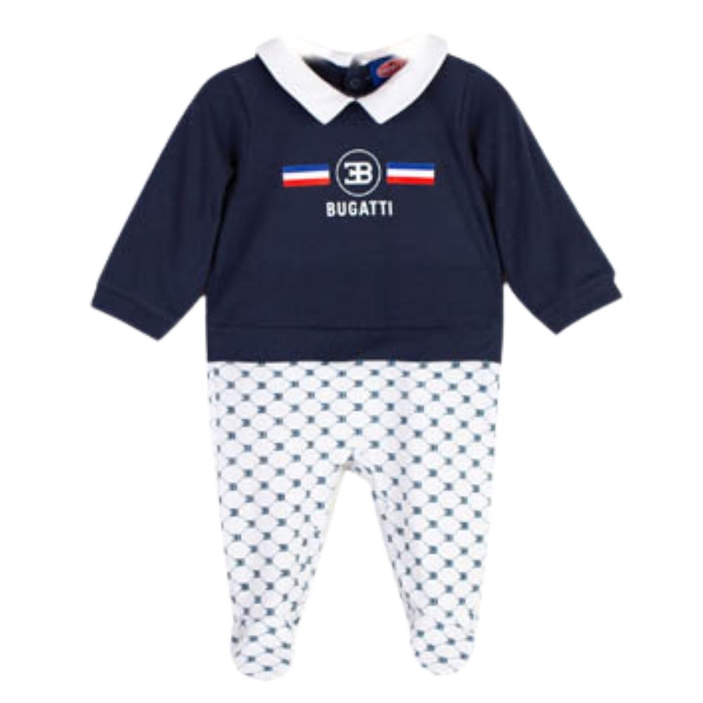 A navy formal logo bodysuit for baby boys from Bugatti. Featuring a white collar, classic logo on the front of a light blue top with a geo logo print beginning at the hem and leading to the footed portion in white.