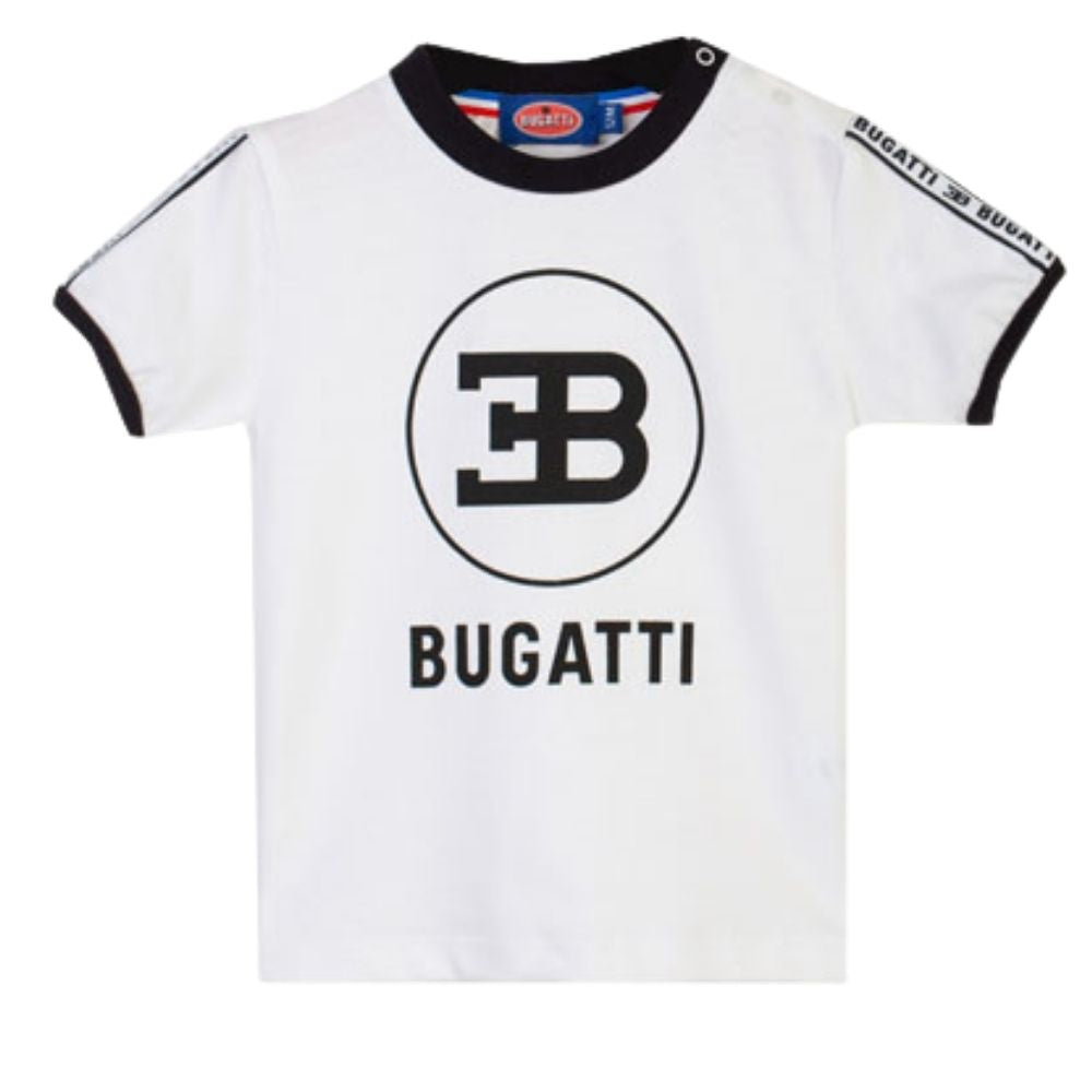 Boys white logo t-shirt by Bugatti Kids. Made from soft cotton, it features a brand logo print in black on the front and logo tape on the sleeve and it has a black neckline and sleeve cuff.