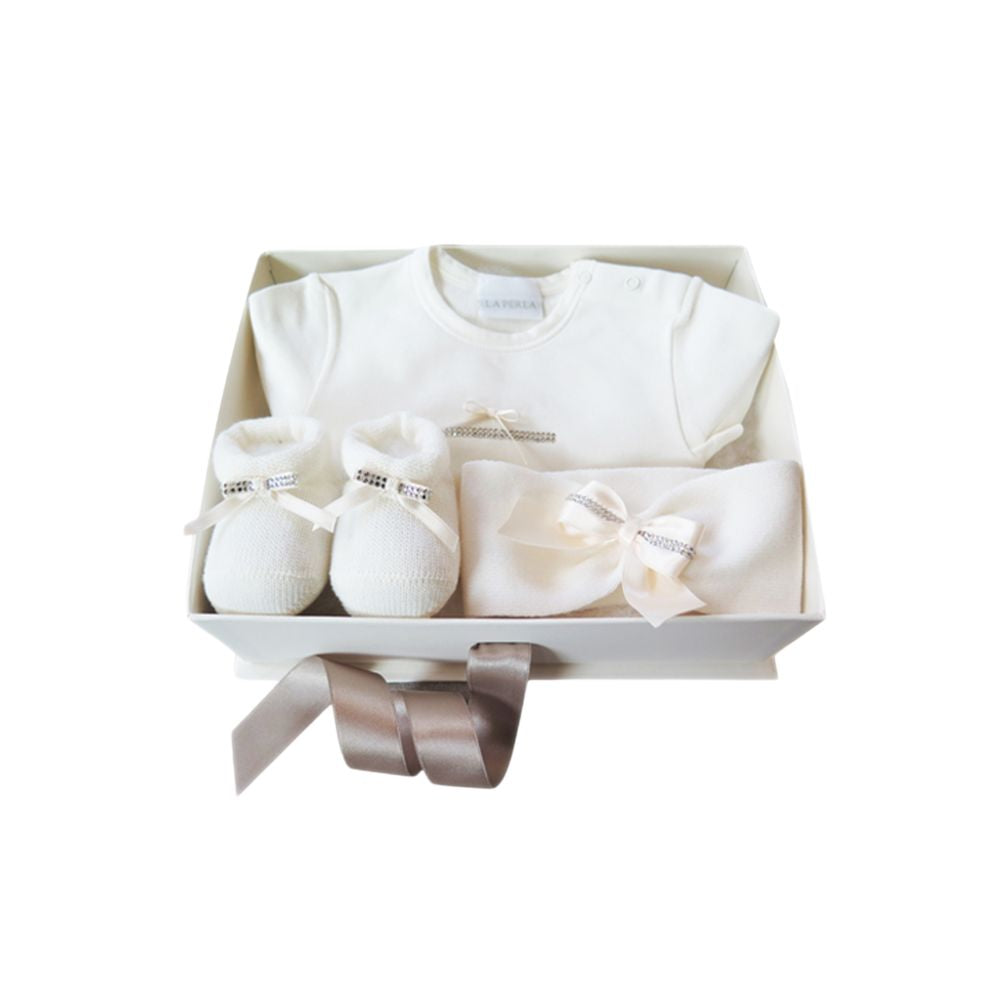 This luxurious La Perla baby set is the perfect embodiment of elegance and comfort, designed to keep your little one cozy and stylish. The set includes a soft ivory outfit, featuring delicate rhinestone embellishments that add a touch of sparkle and sophistication. Accompanying the outfit are matching booties and a headband, both adorned with satin bows and rhinestone details, creating a harmonious and refined look. Crafted from the finest materials, this set ensures that your baby is comfortable while exuding a sense of timeless luxury. Presented in an elegant gift box, this La Perla set makes an exceptional gift for new parents or a perfect choice for special occasions, reflecting the brand's commitment to quality and impeccable design.