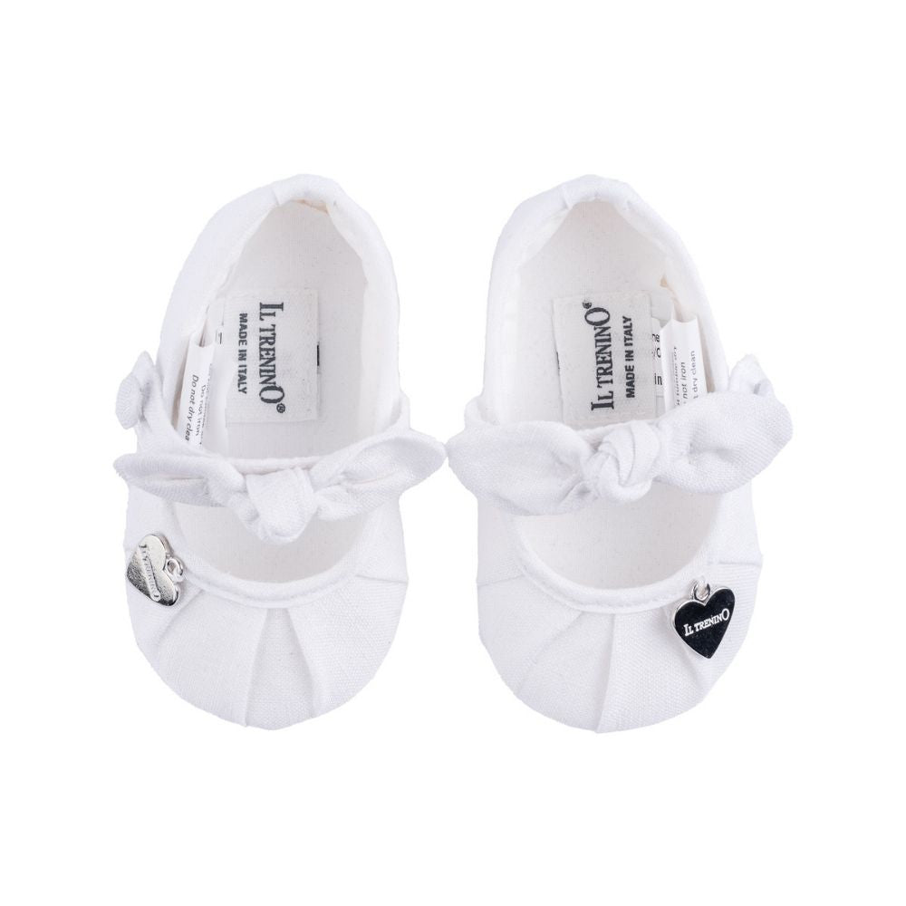 0-6m. These adorable Italian-made baby shoes are a perfect blend of elegance and comfort for your little one. Crafted from high-quality materials, these pristine white shoes feature a charming knotted bow on the front, adding a sweet touch to the design. Each shoe is adorned with a delicate heart-shaped charm, reflecting the exquisite attention to detail synonymous with Italian craftsmanship. Soft and lightweight, these shoes are ideal for special occasions or everyday wear, ensuring your baby's feet are both stylish and comfortable. A timeless addition to any baby’s wardrobe, these shoes are sure to be cherished as a keepsake of your little one’s early years.