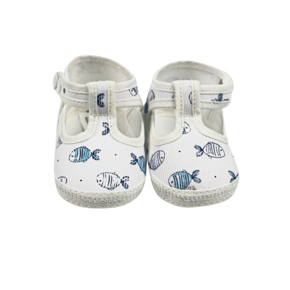 These adorable Italian baby shoes feature fish in blue and white stripes. Designed with a T-bar style for a secure and adjustable fit, these shoes are perfect for little feet. Crafted from soft yet durable materials, they provide comfort and style, making them ideal for any special occasion or everyday wear. Let your baby step out in fashion-forward footwear that combines Italian craftsmanship with a playful, charming design.