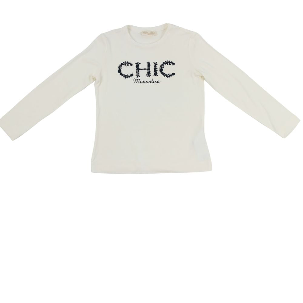 This Monnalisa long-sleeve top is the epitome of effortless style and elegance for your little one. Crafted from soft, comfortable fabric in a classic cream colour, the top features the word "CHIC" beautifully embellished with delicate floral accents, embodying the sophisticated yet playful spirit of the Monnalisa brand. The understated design makes it versatile enough to pair with a variety of bottoms, from jeans to skirts, for a polished look that’s perfect for any occasion. Whether for a day at school or a special event, this top is sure to become a favourite in your child's wardrobe.