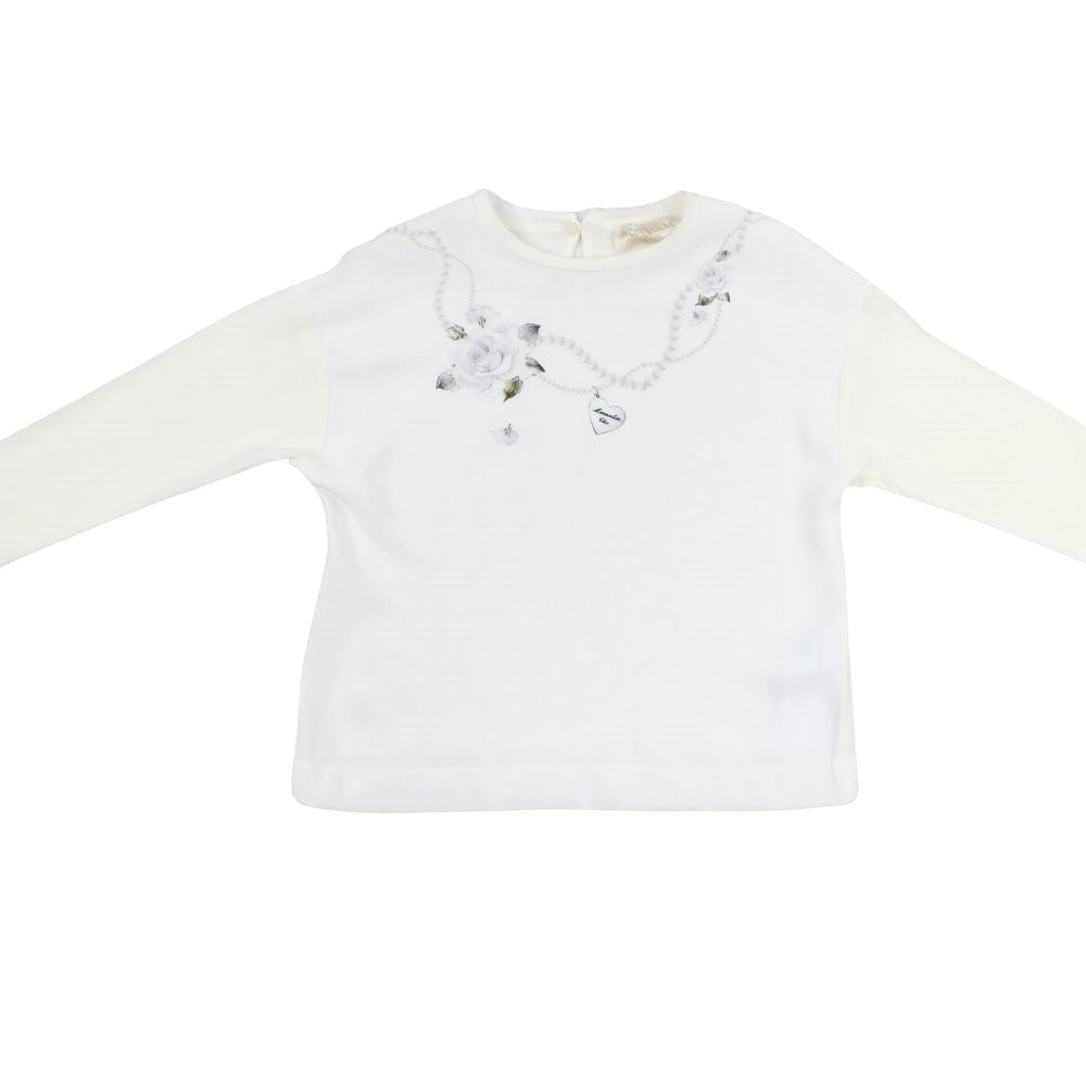 This Monnalisa long-sleeve top is a beautifully elegant piece, perfect for adding a touch of luxury to any little one's wardrobe. Crafted from soft, silky fabric, the top exudes sophistication with its delicate floral and pearl necklace print, which gracefully adorns the neckline. The subtle white roses and charming heart pendant detail create a refined, yet playful look that is signature to Monnalisa’s design aesthetic. This top is ideal for special occasions or when you want to dress up an everyday outfit with a bit of chic flair. Pair it with skirts or tailored pants for a polished and stylish ensemble.