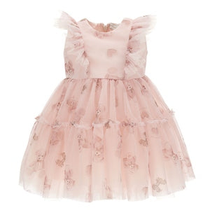 This Monnalisa dress is a dream come true for any little girl who loves to feel like a princess. The dress is beautifully crafted from layers of soft, pink tulle adorned with delicate teddy bear motifs, creating a whimsical and enchanting look. The bodice features ruffled tulle sleeves that add an extra touch of elegance and femininity, while the full skirt is perfect for twirling and dancing. This dress is ideal for special occasions, such as birthdays or weddings, where a touch of magic and luxury is desired. With its charming design and exquisite details, this Monnalisa dress is sure to make any little girl feel truly special.